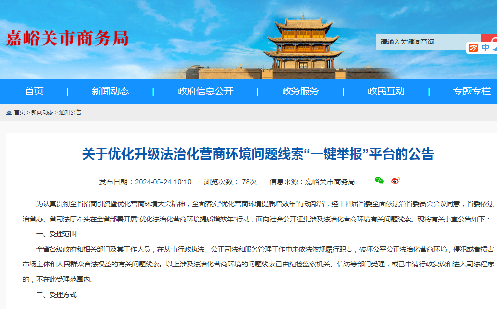 市商务局通过门户网站、“不来即享”平台、相关行业微信工作群向社会和企业公布了《关于优化升级法治化营商环境问题线索“一键举报”平台的公告》,在相关超市、宾馆张贴了《公告》宣传画,广泛宣传开通优化法治化营商环境问题线索“一键举报 ”平台重要意义和受理范围及举报二维码、电话,主动接受社会各界对行政执法工作的监督,切实杜绝行政执法乱作为、不作为、慢作为和任性执法、简单粗暴执法等破坏营商环境建设的违法违纪行为。目前,已在2个网站、8个微信工作群、5处场所上传和张贴《公告》,受众企业(个体)达300余户,进一步扩大了“一键举报 ”平台的知晓度和影响力。